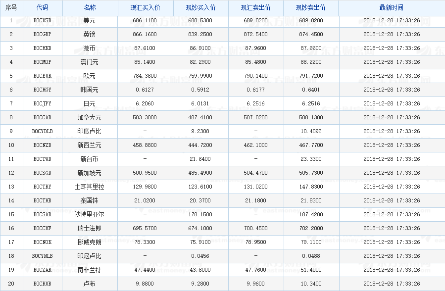 中国银行外汇牌价 2018-12-28(图片来源:东方财富网)