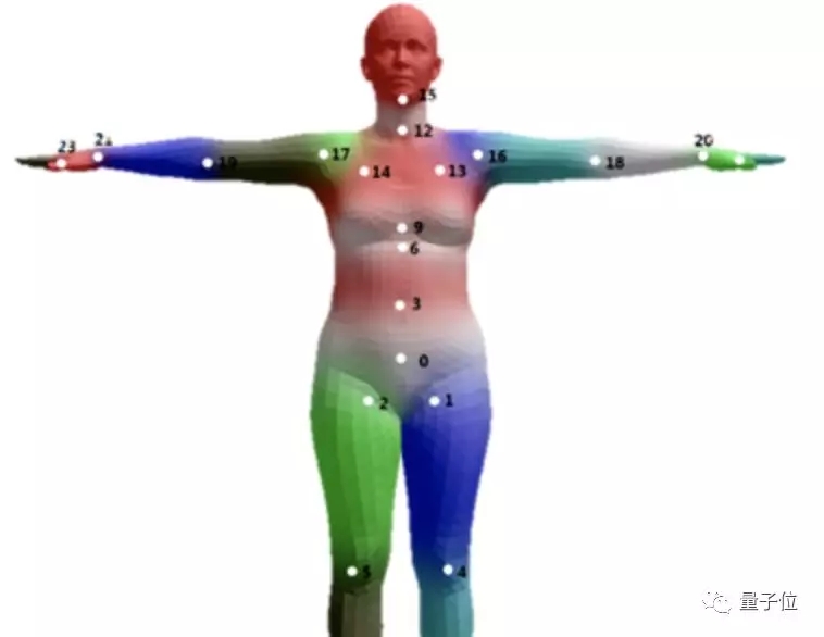 在映射到2D世界时,研究人员将SMPL模型转换成了两种不同的映射形式,一种是肌肉隐约可见的法线图(Normal Map),一种是五颜六色区分了身体不同部位的皮肤图(Skinning Map)。