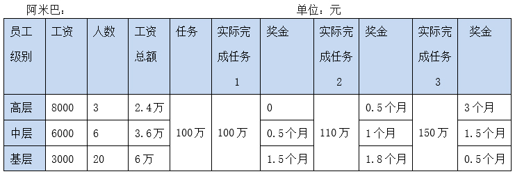 第一,在只完成了目标任务的时候,基层员工获得奖金最多,说明企业高层领导的决策对增加收入没起任何作用,此时是基层员工的作用最大,因此这个阶段应该给基层员工分配较多奖金;