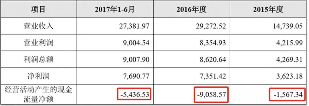 斯诺实业2015年、2016年及2017年上半年营业收入分别为1.47亿元、2.93亿元及2.74亿元,净利润分别为3623万元、7351万元及7691万元,当时披露的文件显示,报告期经营活动产生的现金流量净额均为负数,2015年、2016年及2017年上半年分别为-1567万元、-9059万元及-5437万元。单位:万元