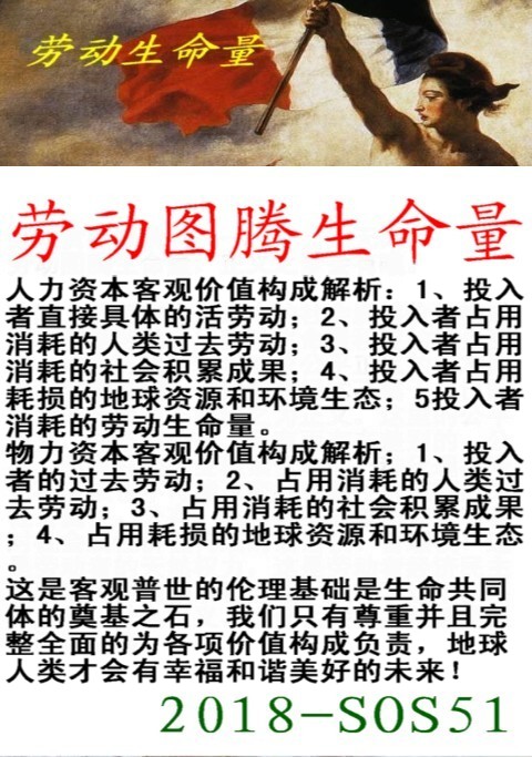 再次分配后又形成物力资本再投入经营运作时,其价值构成中的第2、3、4项社会属性价值构成要素又会在持续经营运作中,在力东人力资本的不断投入和力东直接具体活劳动的不断创造下,不断集结他人劳动和社会积累成果而壮大,这是物力资本在社会发展中的必然结果和本质特征。具有这种本质特征的价值构成在一般等价物——货币中,也就代表着某社会某阶段的所有财富价值的平均价值构成。做为代表平均财富价值构成的一般等价物——货币,它无论掌握在谁手中,无论它等价的是什么,其平均价值构成的素量、属性对生产、分配所起到的基因作用和生物基因决定生物的生长、结果、产子是一样的。所以生产分配方式一般,并非是由所有制决定的,而是由人力资本和物力资本价值构成的源元——“资本基因”所决定的,并且对投入者所投入的价值构成素量的管理与报偿也存在其固有的因果关系,并随着社会积累的变化而变化。因此我们不应该用现代价值构成的资本去运算原始资本积累的方程,更不应该以资产为本去剥夺践踏力东的主体权力,这是背叛物力资本基因禀性的人祸行径。这是不公正,不公平,不道德的,是反人类伦理原则的。随着人类社会的不断发展和力东人力资本的不断投入及社会成果的不断积累,现代资本中第2、3、4项社会属性价值构成要素的积累比例会越来越高,并且也越来越显示出它倍加和自乘的高速积累作用。相对来说物力资本中股东直接具体过去劳动——死劳动的比例也就越来越衰减,但永远是大于零。物力资本中这种社会属性价值构成要素积累比例越来越高,越来越显示出它倍加和自乘的高速积累作用的客观事实,是社会发展的进步,是客观规律的必然。这个规律的必然也将必然的推催出现代生产方式和现代劳资关系的必然之果。
