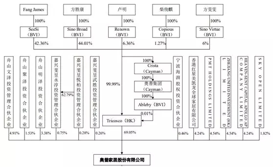 按目前的股权结构,奥普家居的实控人为Fang James(方杰)和方胜康两兄弟,方雯雯与吴兴杰夫妇为实际控制人的一致行动人,方雯雯系实际控制人方胜康之女。