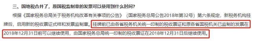 新税务机构挂牌后,启用新的税收票证式样和发票监制章。挂牌前已由各省税务机关统一印制的税收票证和原各省国税机关已监制的发票在2018年12月31日前可以继续使用,由国家税务总局统一印制的税收票证在2018年12月31日后继续使用。纳税人在用税控设备可以延续使用。