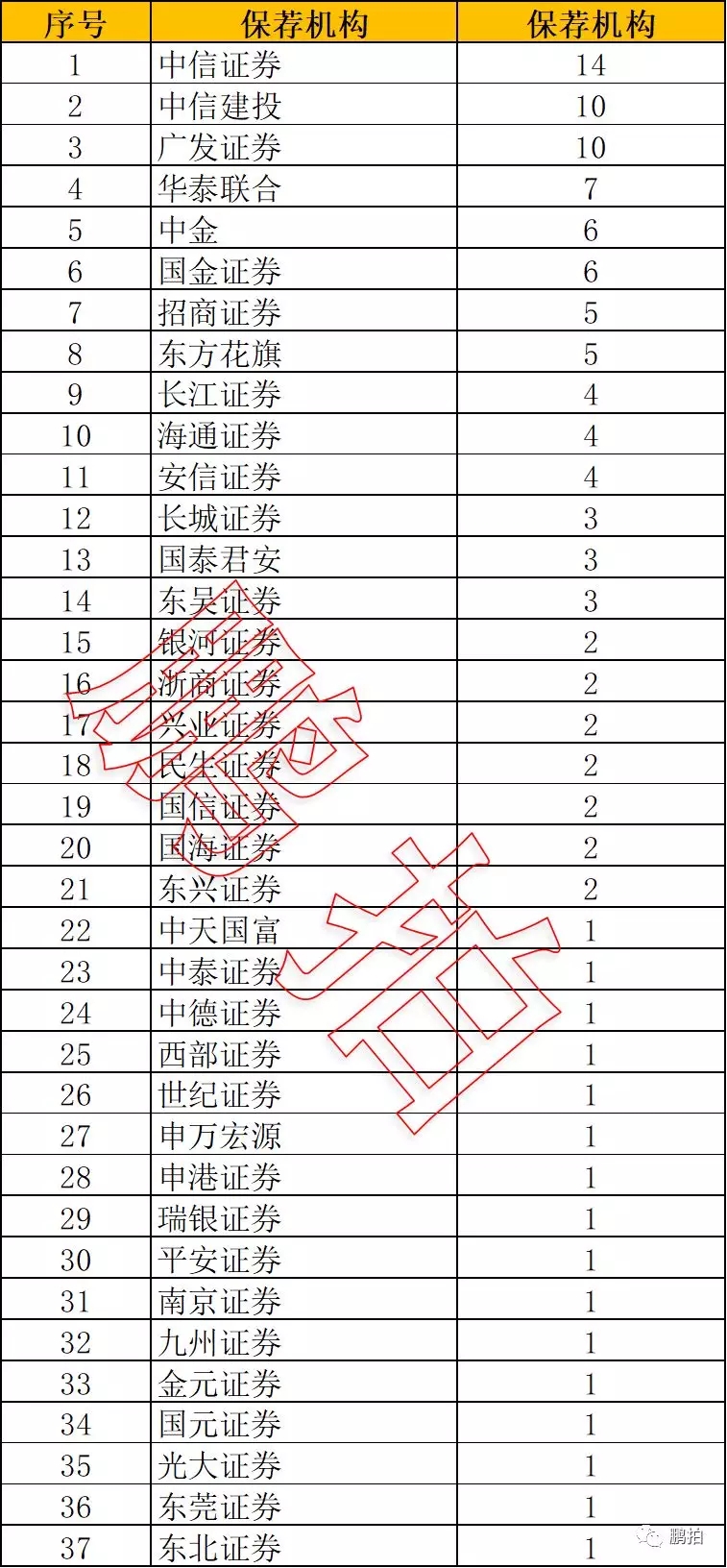 保荐机构37家券商包揽了111家过会IPO。其中前三甲分别为中信证券(14家)、中信建投(10家)、广发证券(10家)。