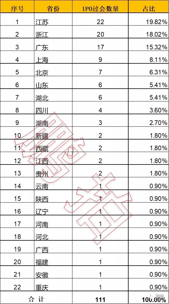 地区分布111家过会企业分布在22个省、自治区或者直辖市。前三甲分别为江苏(22家)、浙江(20家)、广东(17家),合计59家,占比53%。