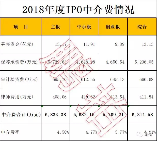 2018年IPO平均中介费6,000万元左右,其中保荐承销费5,000万元左右、审计验资费600万元左右、律师费400万元左右。