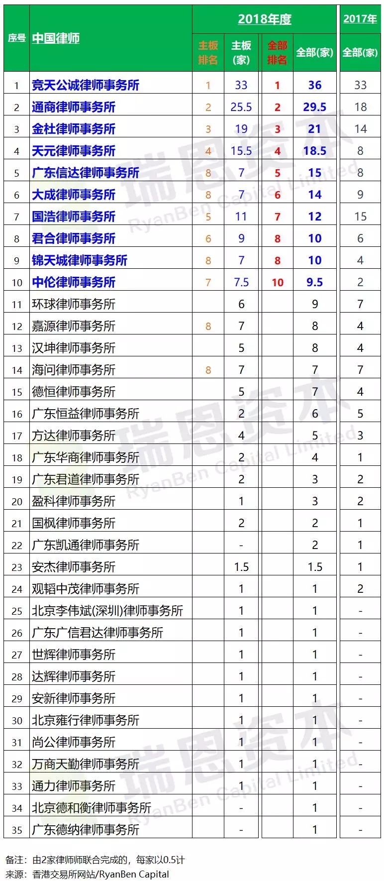 在香港IPO市场,中国律师,主要是以上市保荐人的中国律师、或上市发行人的中国律师身份参与IPO。2018年,共有 35 家中国律师参与了 138 家(涉及到中国业务或资产)新上市公司的香港IPO业务,RyanBen Capital汇总编制排名如下: