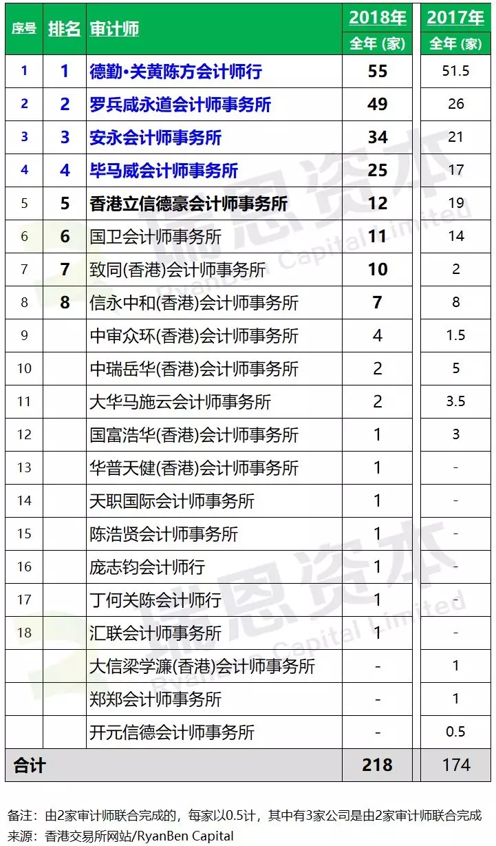 2018年,共有18 家审计师参与了香港 218 家新上市公司的审计业务,RyanBen Capital汇总编制排名如下:
