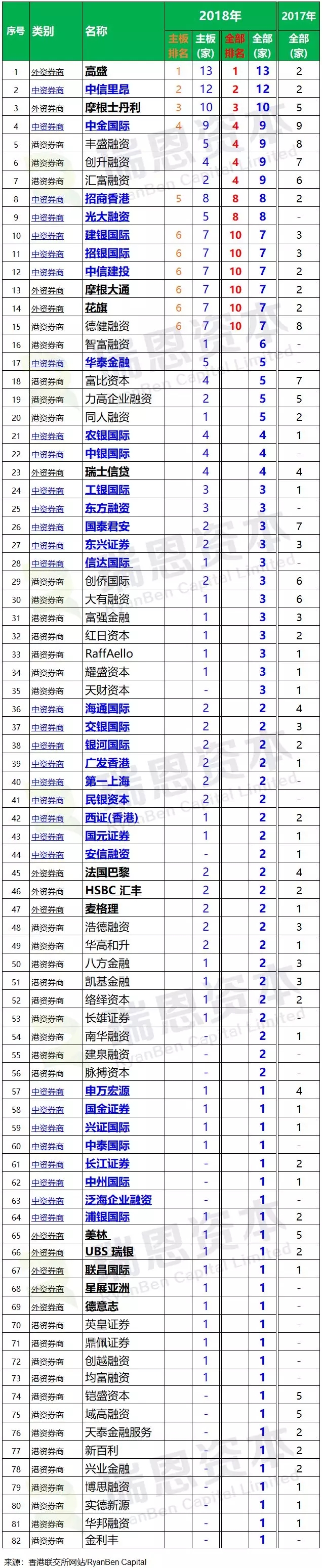 截止2018年底,香港持有保荐人牌照的券商114 家,其中的 82 家券商,在2018年以上市保荐人、或联合保荐人的身份参与了 208 家(不包括GEM转主板的10家)新上市公司的保荐工作,根据他们所参与保荐(包括联合保荐)新上市公司的数量,Ryanben汇总编制排名如下: