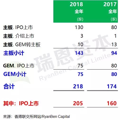 根据香港联交所披露的信息,2018年香港IPO全年新上市公司 218家,其中主板上市 143 家 (包括3家介绍上市、10家GEM转主板)、GEM上市 75 家,具体如下: