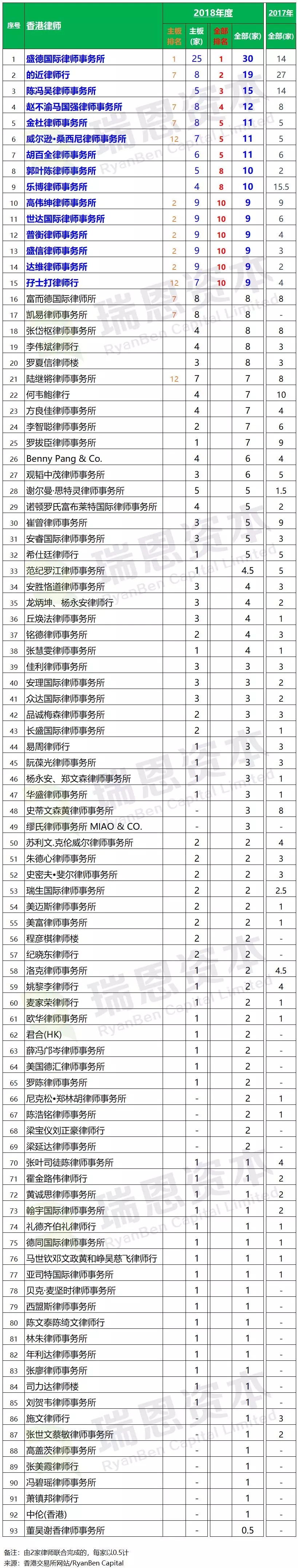 在香港IPO市场,香港律师,主要是以上市保荐人的香港律师、或上市发行人的香港律师身份参与IPO。2018年,共有 93 家香港律师参与了 208 家(不包括GEM转主板的10家)新上市公司的香港IPO业务,RyanBen Capital汇总编制排名如下: