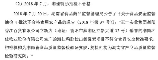 报告期内,湘佳牧业多起食品被检出不合格。