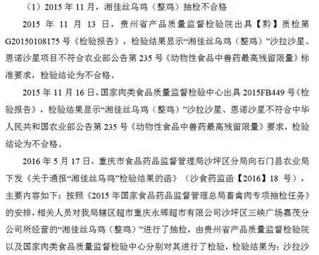 贵州省产品质量监督检验院、国家肉类食品质量监督检验中心、重庆省食品药品监督管理局沙坪区分局,对湘佳牧业的产品“湘佳丝乌鸡(整鸡)”检验均为不合格,违法《动物性食品中兽药最高残留限量》要求。