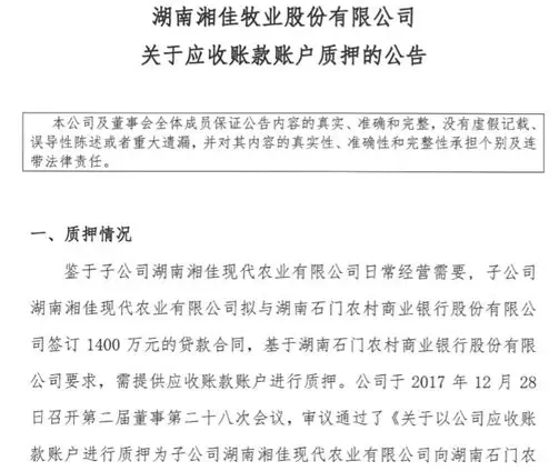 报告表示,鉴于湘佳牧业子公司湖南湘佳现代农业有限公司日常经营需要,子公司拟与湖南石门农村商业银行股份有限公司签订1400万元的贷款合同,湖南石门农村商业银行股份有限公司要求,需提供应收账款账户进行质押。