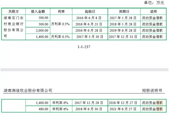 公告还强调本次贷款利率根据市场利率确定。根据招股书,在报告期,湘佳牧业多次向关联方湖南石门农村商业银行申请流动资金抵押贷款,累计达到6280万元,2016年至2017年月利率仅为0.5%,而2018年突增则为6%。