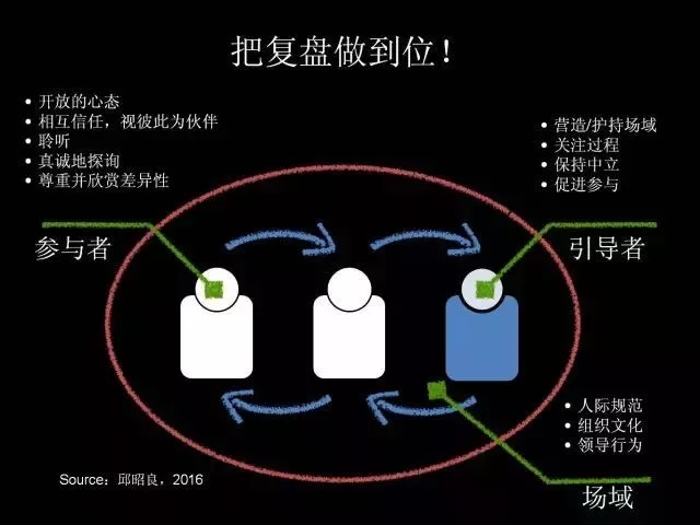对此,除了要求复盘参与者具备开放的心态、坦诚表达、真诚地探询、反思自我、彼此信任、尊重并欣赏差异性等精神之外,也离不开复盘的引导者以及组织文化与氛围的支持。