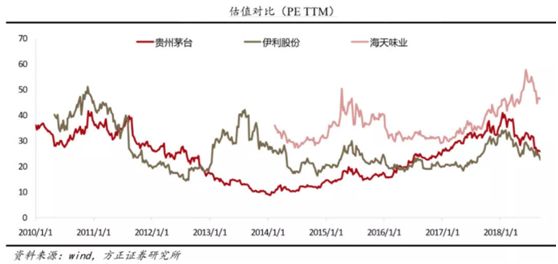估值方面,海天比茅台的估值高1-1.5倍,比伊利的估值高1.5-2倍。