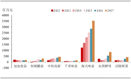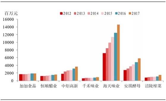 海天蚝油的销售收入从2009年的4.6亿元上升至2017年18.6亿元,年均复合增长率达到19%。