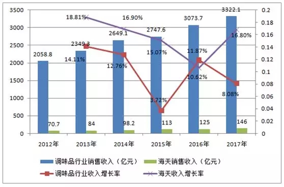 2017年,中国调味品行业市场规模达3322.1亿元,同比增长8.08%,近五年复合增长为10.04%。