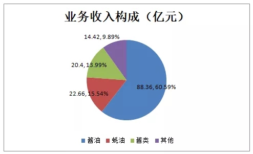 2017年,海天营业收达到146亿元,从业务构成看,酱油88.36亿元,占比60.59%,是其最大的收入来源;耗油22.56亿元,占比15.54%;酱料20.4亿元,占比13.99%,三大主要产品占比超90%。