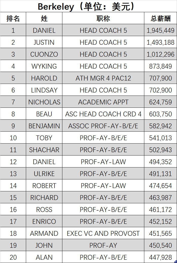 下列三个表列出UC Berkeley、UCLA和UCSD三所分校2017年前20位收入的人员及其Title。总体来看,运动队的主教练和医学院教授整体薪资较高,其他各院系教师之间收入差距不是很大。
