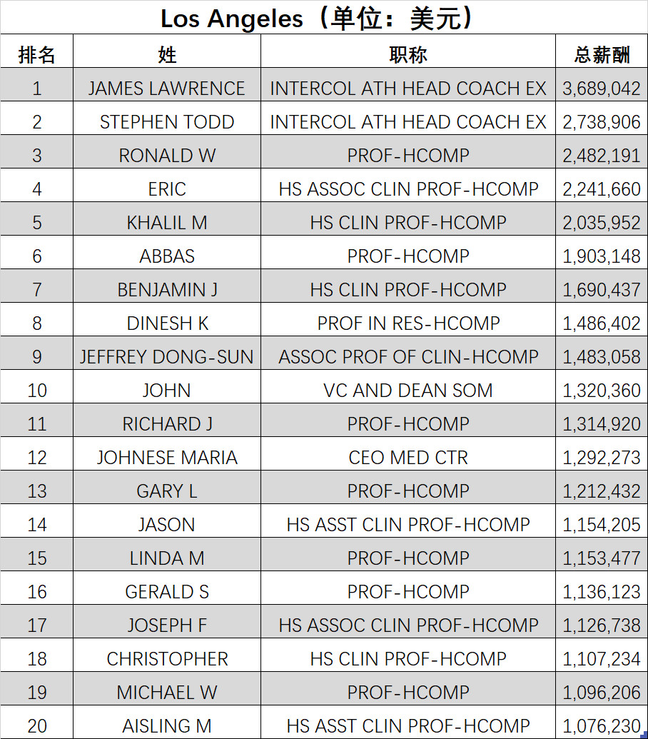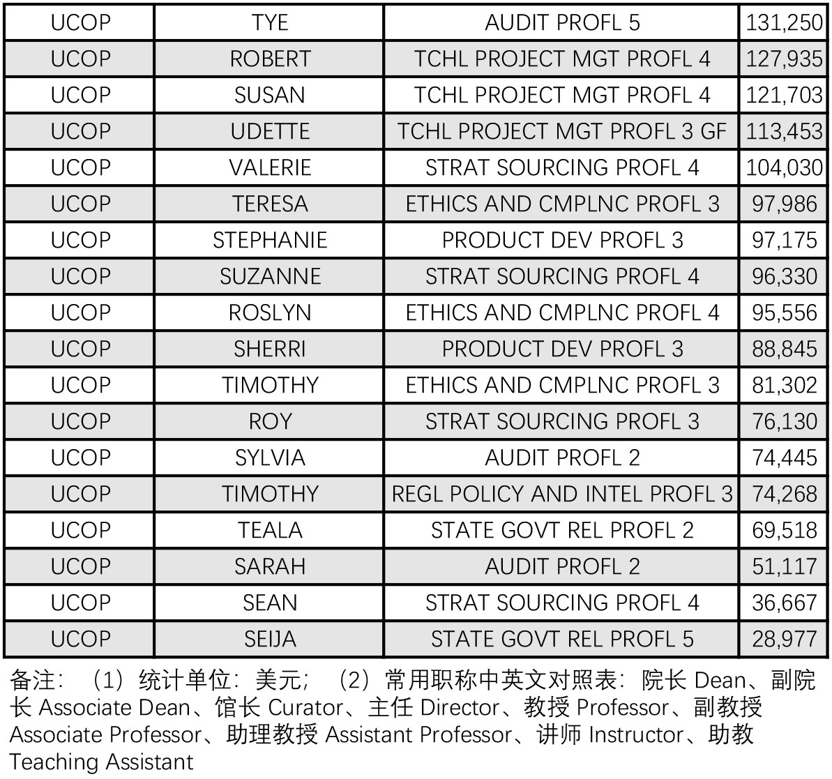 由于表内包含了管理人员、教师、学生、博士后、短期雇员等所有的薪酬数据,因此可以从一定程度上作为全美地区大学的薪酬案例。以下仅遴选部分代表性岗位,一般认为是9个月的工资收入。