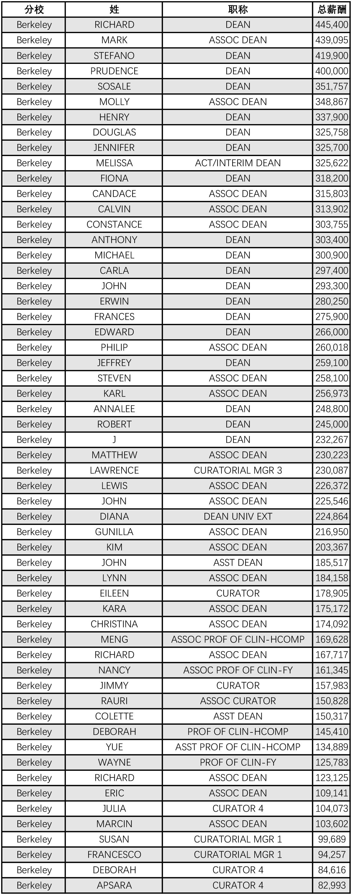 下表列出了几所分校相关职称的人员薪酬情况(部分)。可以看出,院长(Dean)的收入都相当不错,地位很高。