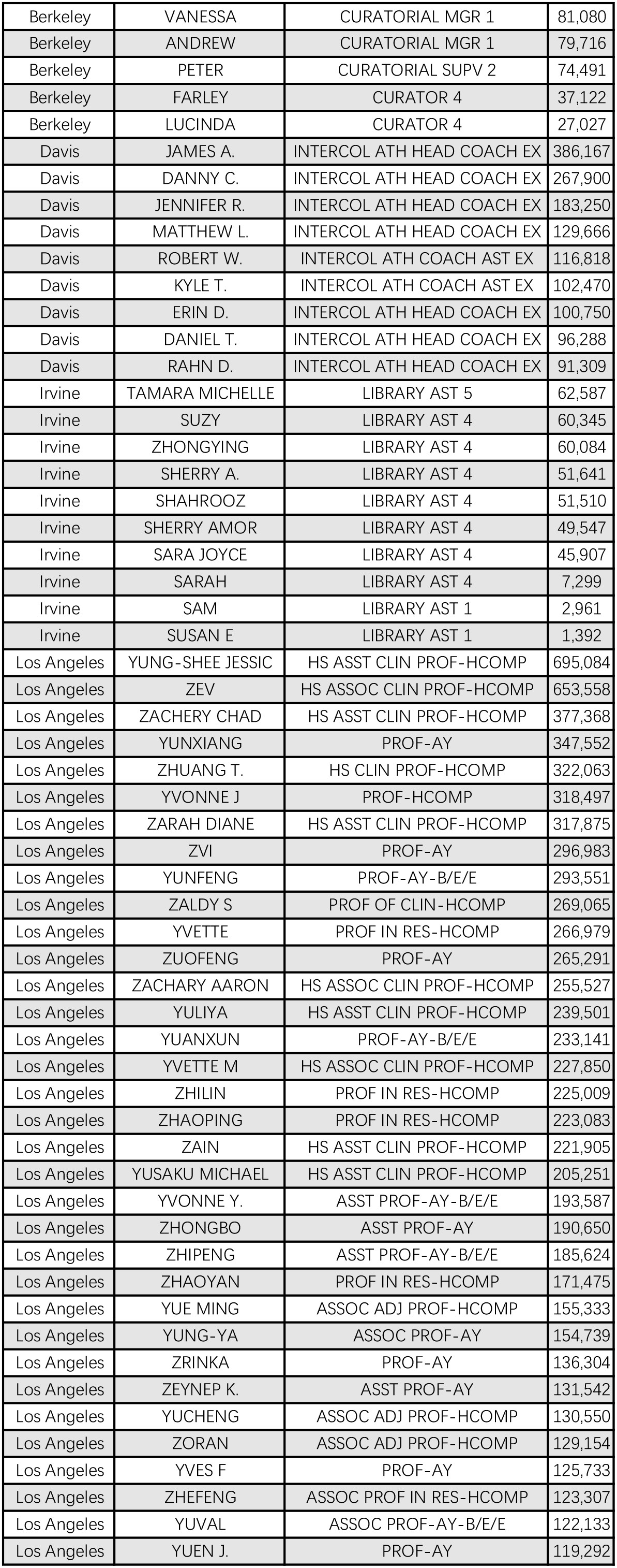 本文以加州大学公开的2017年工资数据为基础,对加州大学系统的薪酬情况进一步统计和分析。加州大学目前有十余所分校,分布在不同的城市。其中比较有名的如:加州伯克利大学(UC Berkeley)、加州大学洛杉矶分校(UCLA)、加州大学圣迭戈分校(UCSD)等等,与我国的中科院系统十分类似。