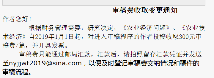 zhw330 发表于 2019-1-2 19:38 农业经济管理投了篇文章,交了100元的审稿费,被拒,让转投农业技术经济。关键是2019年开始审稿费涨成300, ...