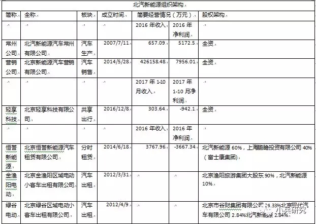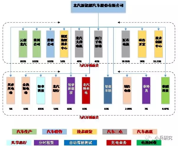 北汽是一家相对来说成熟的企业,在其上市时各业务板块布局均有时日。参照公开材料,对北汽新能源的相关业务进行了整理。可以看出汽车、生产、销售板块对于主机厂来说毋庸置疑是核心业务,也是其核心竞争力所在,都是至少以控股的形式。