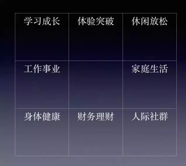 把愿景分门别类的放到这九宫格里,这样,会感觉人生是平衡的。