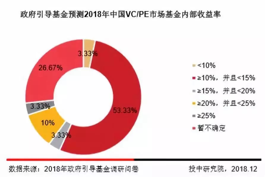 调研结果显示,超半数被调机构对2018年中国VC/PE市场基金内部收益率持审慎态度,预计内部收益率在10%-15%区间,此外26.67%的引导基金表示暂时无法确定基金内部收益率。仅有10%的机构预测2018年中国VC/PE市场基金内部收益率能达到20%-25%。