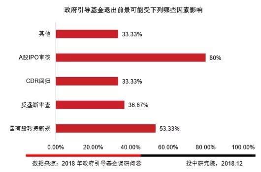 调研结果显示,投资机构退出的首选路径为IPO,80%的被调引导基金表示A股IPO审核趋严对VC/PE的影响已经显现。53.33%的引导基金认同国有股转持新规解除了束缚在国资控股投资机构Pre-IPO业务上的枷锁。36.67%的引导基金认为反垄断审查是并购退出成败的关键。33.33%的引导基金看好GP可借道CDR实现中概股项目退出与股票套现。此外,33.33%的引导基金相信整体金融环境及社会融资形势等其他因素影响政府引导基金退出。