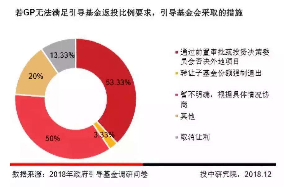 调研结果显示,53.33%的政府引导基金表示若GP无法满足返投比例要求,会采取前置审批或投委会否决外地项目。50%的政府引导基金对此暂无明确措施,将根据具体情况与子基金GP协商。此外,13.33%的政府引导基金会取消让利。