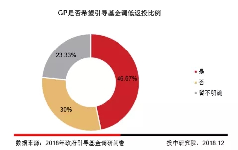 调研结果显示,46.67%的政府引导基金GP希望引导基金调低返投比例,30%的政府引导基金GP表示不需要引导基金调低返投比例。