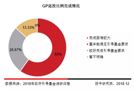 调研结果显示,60%的政府引导基金GP返投比例基本能满足引导基金要求,但仅有26.67%的政府引导基金GP较好的满足引导基金返投比例要求。