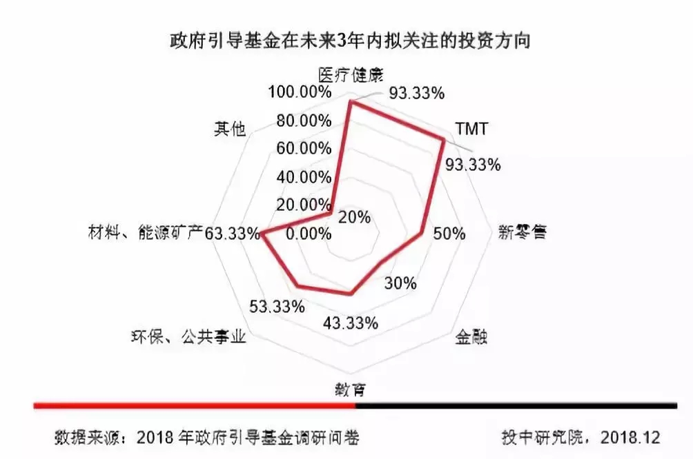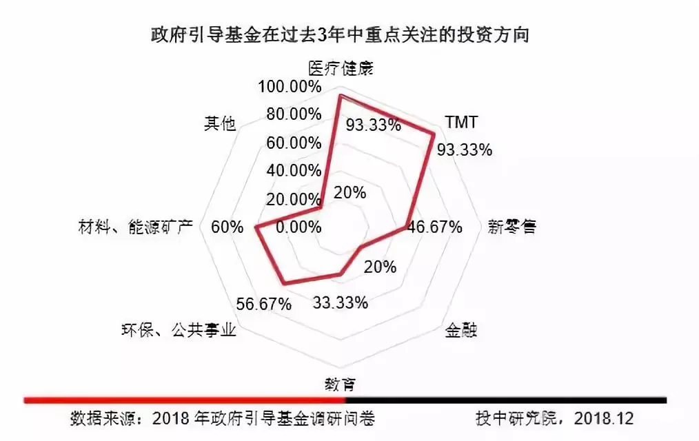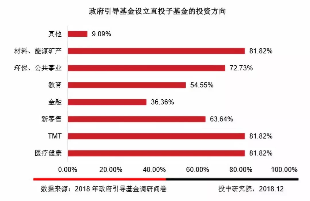 调研结果显示,81.82%的政府引导基金设立的直投子基金的投资方向倾向于医疗健康、TMT和材料能源领域。此外,政府引导基金设立的直投子基金的重点投资方向还包括新零售、教育和环保领域。