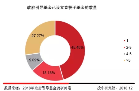 已经设立直投子基金的引导基金中,45.45%的引导基金已设立直投子基金数量为1支,18.18%的政府引导基金已设立直投子基金的数量为2-3支。已设立直投子基金的数量大于5支的政府引导基金为27.27%。