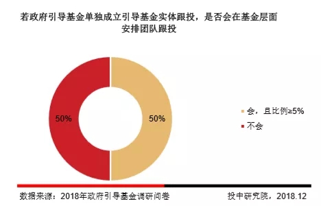 调研结果显示,对于“若政府引导基金单独成立引导基金实体跟投,是否会在子基金层面安排团队跟投”这一问题,半数政府引导基金选择会有小于5%的子基金层面跟投,其余半数的政府引导基金表示不会在子基金层面安排团队跟投。