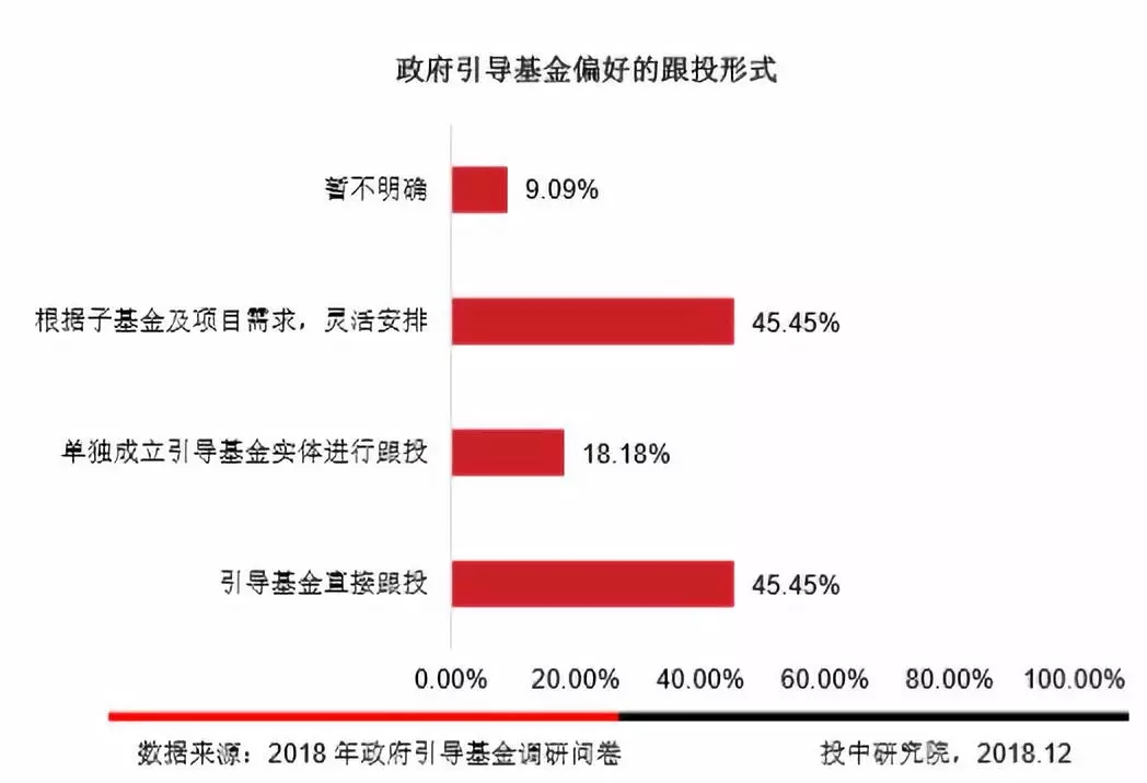 45.45%的政府引导基金偏好直接跟投模式,此外45.45%的政府引导基金倾向于根据子基金及项目需求,灵活安排跟投,该调研结果可以看出政府引导基金的跟投模式都比较灵活多元。