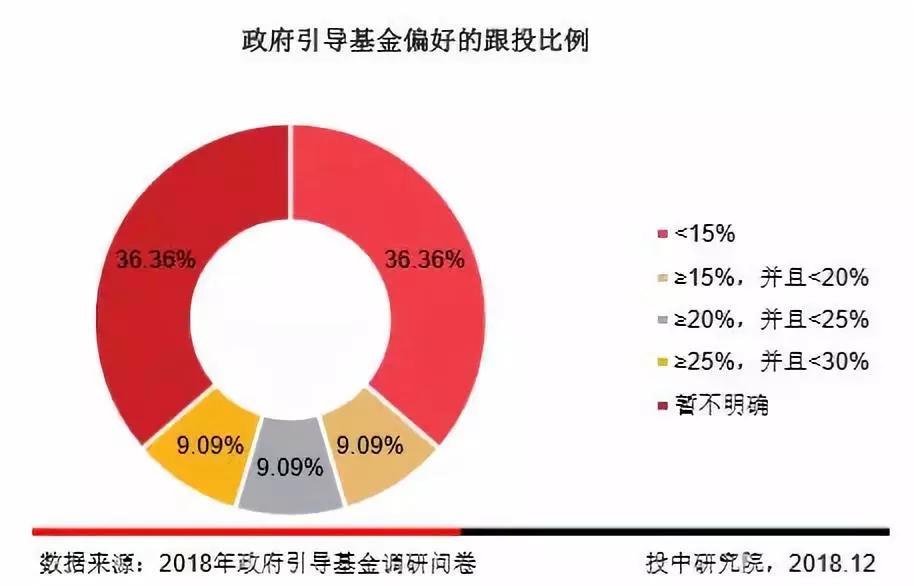 调研结果显示,36.36%的政府引导基金偏好小于15%的跟投比例,36.36%的政府引导基金暂无明确跟投比例。