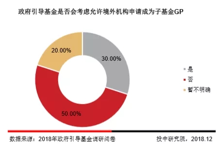 50%的政府引导基金暂不考虑允许境外机构申请成为子基金GP,另有30%的政府引导基金开始考虑允许境外机构申请成为子基金GP,这一调研结果显示本土政府引导基金对境外机构成为专业GP的能力和适应力持谨慎态度。