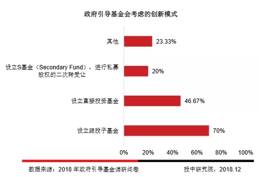 调研结果显示,70%的政府引导基金考虑的创新模式为设立子基金跟投模式,46.67%的政府引导基金选择设立直接投资基金模式,20%的政府引导基金选择设立S基金模式。可以看出国内政府引导基金开始逐步发展私募股权二手份额转让市场。