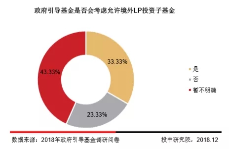 调研结果显示,43.33%的政府引导基金暂时不明确是否允许境外LP投资子基金,33.33%的政府引导基金会考虑允许境外LP投资子基金。可以看出政府引导基金对于境外LP是一个谨慎积极的态度。