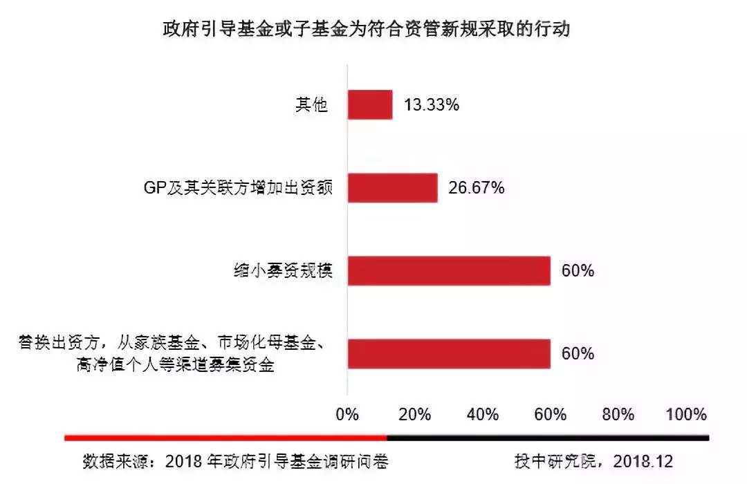 调研结果显示,选择替换出资方,从家族基金、市场化母基金、高净值个人等渠道募集资金,或者缩小募资规模的政府引导基金或子基金各占60%。这一调研结果可以看出政府引导基金应对资管新规有进退两种选择:一是替换出资方,保证募资的规模;二是直接缩小募资规模,稳步发展。