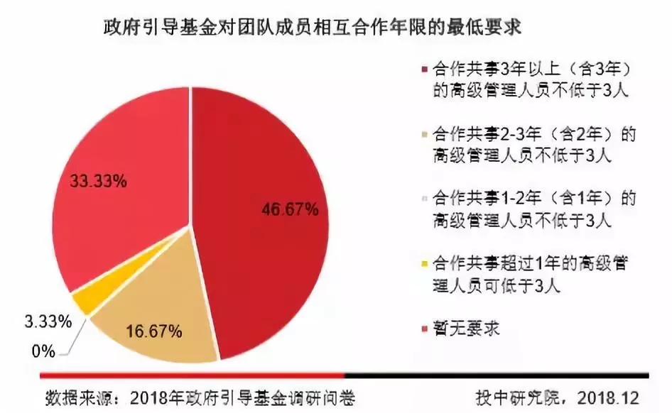 超过六成的ZF引导基金要求子基金GP共事的高级管理人员不低于3人,ZF引导基金希望团队成员之间拥有较为成熟的合作关系。