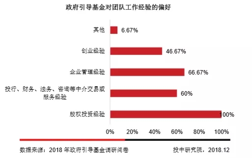 100%的被调者表示ZF引导基金在筛选团队时偏好拥有股权投资经验的团队,超过六成的ZF引导基金偏好团队拥有企业管理经验。