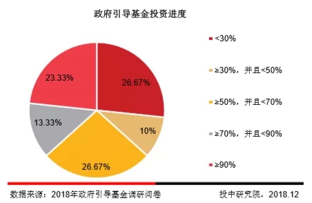 参与调研的ZF引导基金中,投资进度在50%及以上的引导基金共计19支,占统计总量的63.33%,其中投资进度在90%及以上的占23.33%。