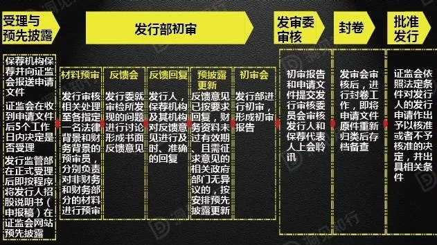 按照依法行政、公开透明、集体决策、分工制衡的要求,首次公开发行股票的审核工作流程分为受理与预先披露、发行部初审、发审委审核、封卷、核准发行等主要环节,分别由证监会发行监管部不同处室负责,相互配合、相互制约。对每一个发行人的审核决定均通过会议以集体讨论的方式提出意见,避免个人决断。主要流程详细情况如下: