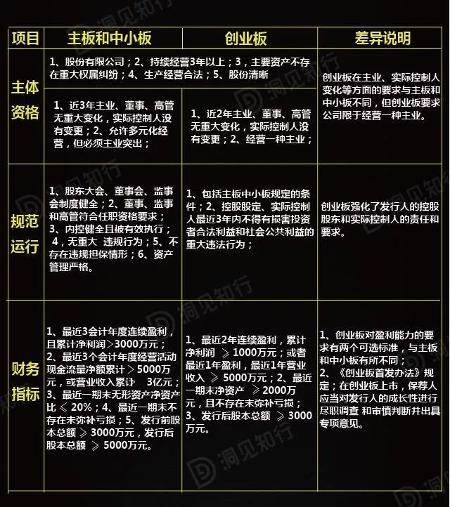 上表仅对企业在主板、中小板、创业板首次公开发行股票并上市应具备的主要条件进行了简要差异比较,具体条件可查阅中国证监会发布的《首次公开发行股票并上市管理办法》和《首次公开发行股票并在创业板上市管理办法》。